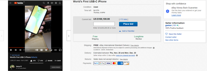 W październiku szwajcarski inżynier Ken Pilonnel wymienił Lightning na USB-C w swoim iPhone X, a w tym tygodniu postanowił sprzedać smartfon na eBay. Podczas gdy w dniu rozpoczęcia aukcji cena wynosiła zaledwie 4 000 dolarów, dwa dni później wzrosła 25-krotnie.
