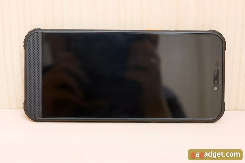 O tak, w przeciwieństwie do typowych nowoczesnych smartfonów, rysowanych jak kopia, tutaj jest na co popatrzeć. Przedni panel AGM H3 jest wykonany w duchu dni "pre-Desrama", z dużą kratką głośnika zajmuje miejsce pod ekranem i old-school ramki zawierające głośnik talkback, przedni aparat i czujniki można zobaczyć na górze.