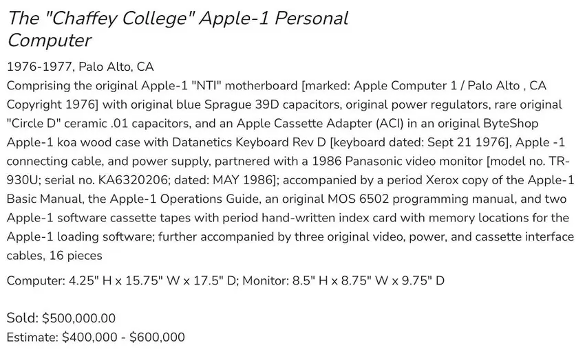 Komputer prezentowany jest w obudowie wykonanej ze specjalnego drewna - rzadkiego hawajskiego koa. Nazywa się Apple I i nadal działa. Model ten jest jednym z 200 komputerów tego typu wyprodukowanych i sprzedawanych w początkach istnienia firmy Apple. "To rodzaj Świętego Graala dla kolekcjonerów retro elektroniki i technologii komputerowej", Apple-1 ekspert Corey Cohen powiedział Los Angeles Times przed wtorkowej aukcji.