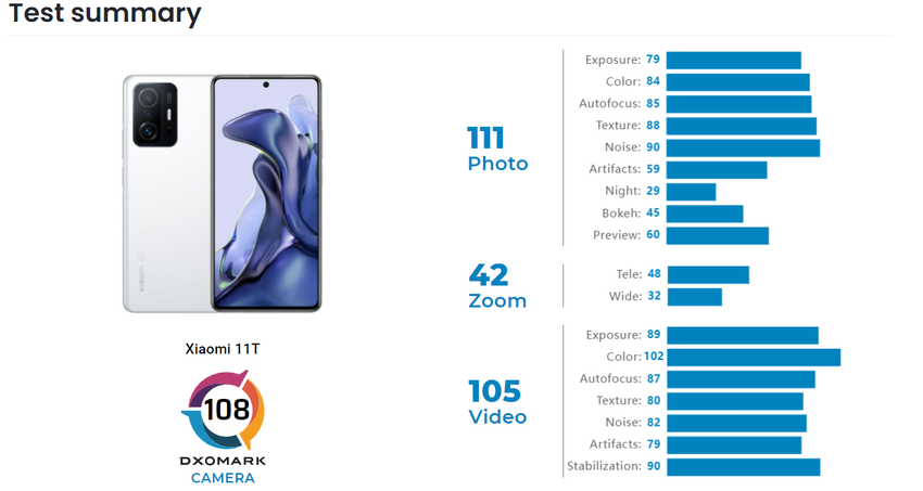 Możliwości fotograficzne Xiaomi 11T zostały ocenione na 111 punktów, natomiast za rejestrowanie materiałów wideo otrzymał 105 punktów. Możliwości zoomu zostały ocenione na 42 punkty, a aparat ultraszerokokątny (8 MP) na 32 punkty. Bohater notki plasuje się w ogólnym rankingu, delikatnie mówiąc, daleko.
