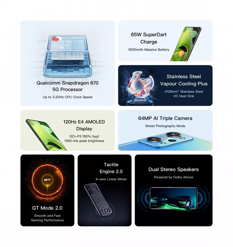 Przypomnijmy, Realme GT Neo 2 zadebiutował w Chinach we wrześniu. W październiku, nowość została wydana w Indiach. Smartfon posiada 6,64-calowy wyświetlacz FHD+ E4 AMOLED Samsung 120Hz, procesor Snapdragon 870 oraz potrójny aparat główny 64 MP + 8 MP (szeroki) + 2 MP (czujnik głębi) i pojedynczą kamerę przednią 16 MP. Urządzenie zasilane jest baterią o pojemności 5000mAh. Obsługuje szybkie ładowanie 65W. Po wyjęciu z pudełka smartfon jest wyposażony w system Android 12 i autorską powłokę Realme UI 3.0