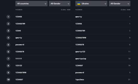 Mieszkańcy Ukrainy również nie przejmują się kwestiami bezpieczeństwa. Pierwsze miejsce zajmuje hasło qwerty, które znajduje się na czwartej linii światowego rankingu. Kombinacje 123456 i 123456789 zajęły odpowiednio drugie i trzecie miejsce