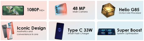 Jeśli chodzi o wydajność, w smartfonie za to odpowiada ośmiordzeniowy procesor MediaTek Helio G85. Chip działa zgodnie z harmonogramem Mali-G52, 6 GB RAM i 64 GB pamięci. Spark 8 Pro jest zasilany baterią o pojemności 5000 mAh. Obsługuje szybkie ładowanie 33W. Słuchawka posiada również boczny skaner linii papilarnych oraz funkcję Face Unlock. Urządzenie działa od razu po wyjęciu z pudełka z systemem Android 11.