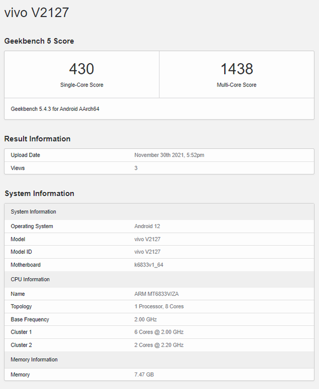 Vivo V55 z Dimensity 700 i Androidem 12 testowane na Geekbench