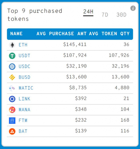 Inwestorzy aktywnie kupowali także inne altcoiny. W szczególności Decentraland (348 USD), Fantom (232 USD) i Basic Attention Token (139 USD). Lista najczęściej kupowanych aktywów obejmuje trio stablecoinów powiązanych z USD - USDT (10794 USD), USDC (32 190 USD) i BUSD (13 600 USD).