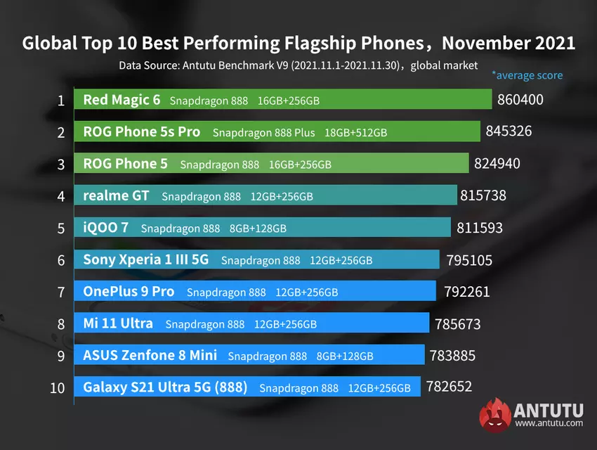 Pomiędzy tymi dwoma modelami na Snapdragon 888 ustanowił się model ASUS ROG Phone 5s Pro. Według wyników z listopada AnTuTu przyznało mu średnio 845 326 punktów. Smartfon jest wyposażony w podkręcony jednoukładowy procesor Snapdragon 888+.