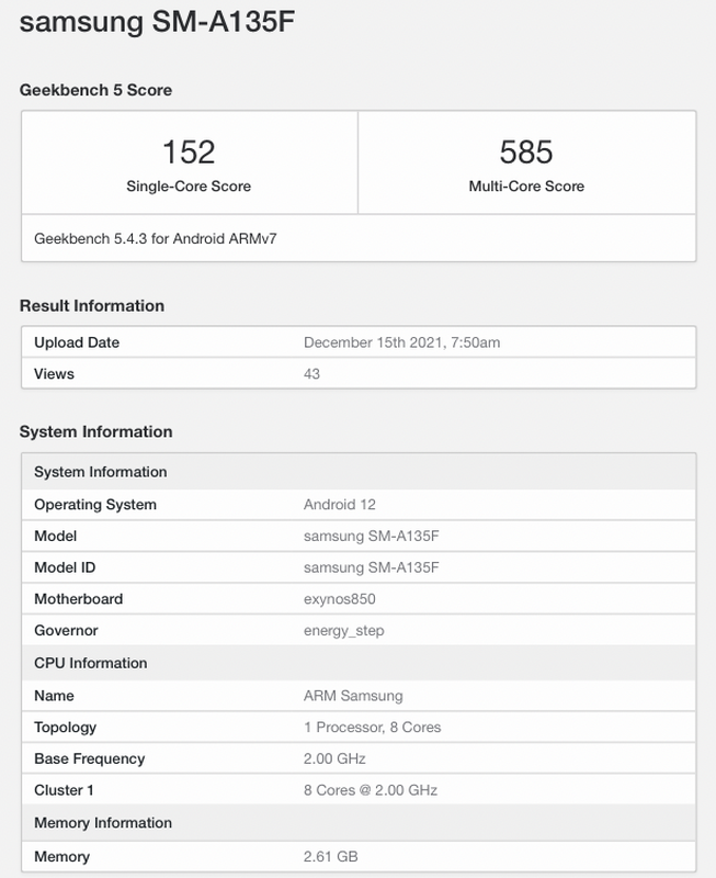 Mowa o Galaxy A13 4G. Urządzenie zostało zauważone w bazie danych Geekbench z numerem SM-A135F. Raport mówi, że nowy produkt będzie wyposażony w 3 GB pamięci RAM. Ponadto urządzenie otrzyma preinstalowany system operacyjny Android 12 z powłoką One UI 4.0 i zastrzeżony ośmiordzeniowy procesor Exynos 850. Dla porównania, smartfon w wersji 5G działa na chipie MediaTek Dimensity 700.