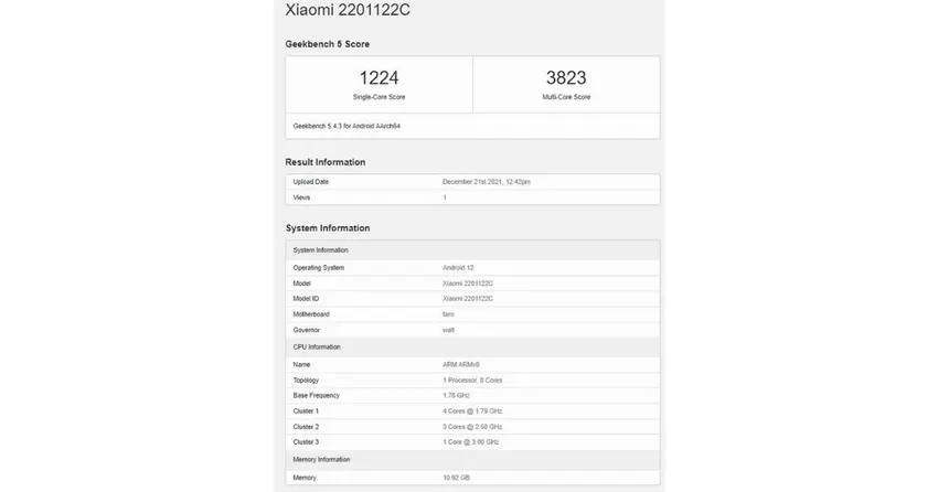Benchmark pokazuje modyfikację z 12 GB pamięci RAM. Oprogramowanie potwierdza, że ​​Xiaomi 12 Pro będzie zasilany przez Snapdragon 8 Gen1 SoC. Po wyjęciu z pudełka flagowiec otrzyma system operacyjny Android 12.