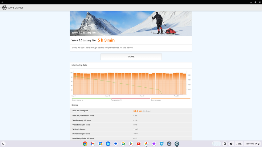 Acer nie podaje specyfikacji baterii, ale obiecuje, że Chromebook 314 może wytrzymać do 11,5 godziny na jednym ładowaniu. W teście PCMark laptop wytrzymał 5 godzin. Ale podczas testu jasność ekranu była maksymalna. Po zmniejszeniu jasności i cyklicznym odtwarzaniu filmów laptop wytrzymał nieco ponad 7 godzin.