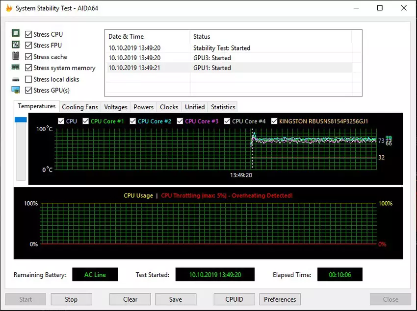W teście warunków skrajnych AIDA64 temperatura procesora wzrosła na początku do około 90-95° i zaobserwowano minimalne dławienie 5%, po czym układ chłodzenia dostosował się do obciążenia, a następnie temperatura wnętrza nie wzrosła powyżej 75° i system działał stabilnie. Jednocześnie występuje hałas, jak we wszystkich modelach dla gier, ale nie powyżej rozsądnego poziomu. Nie jest głośniejszy od dzwięku wbudowanych głośników, a w otoczeniu biurowym wcale nie jest zbyt zauważalny. Badanie przeprowadzono w automatycznym trybie pracy SC. W przypadku najbardziej ekstremalnych obciążeń dostępny jest tryb Coolboost, w którym prędkość wentylatora wzrasta o kolejne 10%. Chociaż w rzeczywistych warunkach nie było takiej potrzeby.
