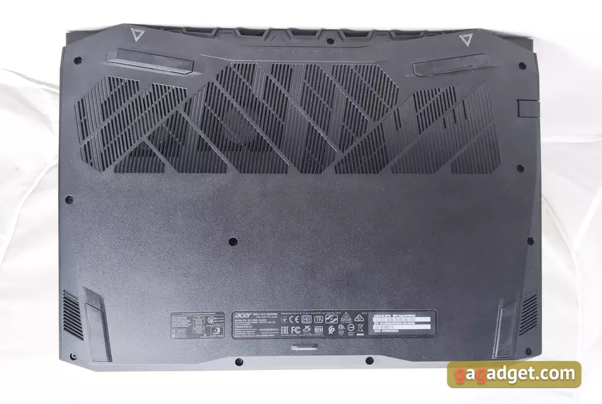 W dolnej części obudowy znajdują się 4 szerokie gumowane nóżki i duża liczba otworów do wlotu zimnego powietrza, z których widać 2 wentylatory układu chłodzenia. Dwa trójkąty z tyłu laptopa ostrzegają o potencjalnie gorących obszarach laptopa. Widzieliśmy to już w innych modelach dla gier Acer. Niestety postanowili zrezygnować z poszczególnych „klap” dla niezależnej wymiany pamięci RAM i napędów, więc aby uzyskać dostęp do wnętrza, trzeba odkręcać 11 śrub i zdejmować całą dolną pokrywę: