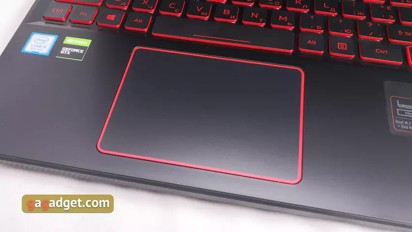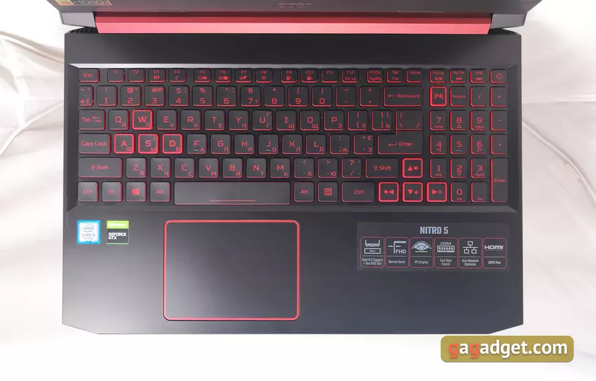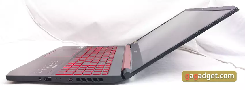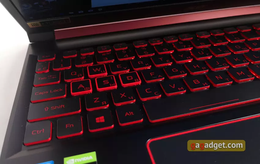 Zawias umożliwia otwarcie laptopa pod kątem około 145 °, co wystarcza na laptop do gier. Ekran jest dobrze zamocowany we właściwej pozycji. Powierzchnia robocza jest wykonana z tworzywa sztucznego. Układ jest pełnowymiarowy, z dodatkową jednostką cyfrową. Ale nie ma przerwy między nim a blokiem głównym, podobnie jak blok strzelec nie jest oddzielony. W rezultacie prawy Shift jest nieco przycięty. Z dodatkowych funkcji — jest osobny przycisk do uruchamiania zastrzeżonego narzędzia Acer NitroSense. W reszcie nie ma niespodzianek: długie Enter, Backspace i lewy Shift, rząd F nieco zmniejszony po wysokości. Przycisk zasilania znajduje się w prawym górnym rogu.