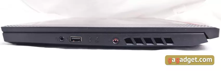 Po prawej stronie znajduje się wbudowane gniazdo audio, jedno złącze USB 2.0, wskaźniki LED, gniazdo do podłączenia zasilacza i otwory wentylacyjne wlotu powietrza: