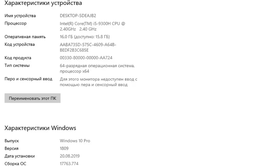 Jak wspomnieliśmy wcześniej, w skład tego zestawu mogą wchodzić najnowsze procesory Intel 9. generacji w architekturze Coffee Lake Refresh lub świeżego Ryzen. Dostaliśmy konfigurowanie z procesorem Intel Core i5-9300H, który jest najmłodszy w obecnej serii procesorów mobilnych. W rzeczywistości jest to aktualizacja zeszłorocznego Intel Core i5-8300H z niewielkim wzrostem częstotliwości. Core i5-9300H to czterordzeniowy procesor o częstotliwości taktowania 2,4 GHz i Turbo Boost do 4,1 GHz. Obsługiwane 8 Hyper Threading wątków. Pakiet ciepła nie zmienił się — 45 watów. Jako akcelerator grafiki używany NVIDIA GeForce GTX 1650 z 4 GB standardowej pamięci wideo GDDR5. 16 seria odnosi się do stosunkowo niedrogich rozwiązań i nie obsługuje śledzenia promieni, a to wszystko, co jest w 20 serii. Karta wideo wykorzystuje 12-nm układ TU117, częstotliwości rdzenia graficznego — 1395-1560 MHz. Konfiguracja nie jest najlepsza, ale wystarczy dla większości nowoczesnych gier żeby wygodnie grać w rozdzielczości FullHD. Ilość pamięci RAM to 16 GB DDR4 o częstotliwości 2666 MHz. Moduły bezprzewodowe: WiFi 802.11 ac 2x2 MIMO i Bluetooth 5.0, jest przewodowy Gigabit Ethernet.