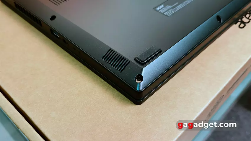 Z przodu nie ma żadnych funkcjonalnych elementów. Z tyłu znajdują się dwa zawiasy, duży obszar z otworami chłodzącymi i dwie gumowe wkładki, które podtrzymują laptopa w pozycji otwartej.