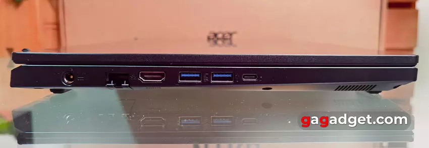 Wszystkie dostępne złącza znajdują się po bokach laptopa. Po lewej stronie znajduje się gniazdo zasilania, wysuwany port sieciowy RJ-45, HDMI 2.1, dwa pełnowymiarowe porty USB 3.2 Gen 1 (jeden z nich obsługuje ładowanie urządzeń zewnętrznych, gdy laptop jest wyłączony) oraz USB Type-C 3.2 Gen 2 (z Thunderbolt 4, DisplayPort i 65W Power Delivery). Tak więc laptop może być również zasilany przez zasilacz Type-C innej firmy. Ale, jak zwykle, w trybie niskiej wydajności przy użyciu tylko wbudowanej grafiki.