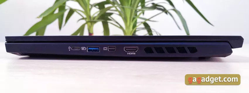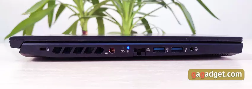 Acer Predator Helios 300 jest daleki od najbardziej kompaktowego laptopa i wszystko jest w porządku ze złączami. Po lewej stronie znajduje się gniazdo blokady Kensington, otwory wentylacyjne, port do podłączenia zasilacza, para wskaźników LED, przesuwne RJ-45, dwa pełnowymiarowe złącza USB 3 i połączone gniazdo 3,5 mm: