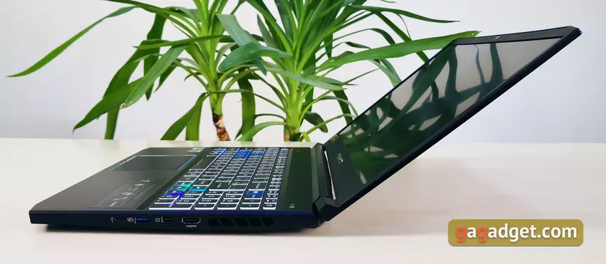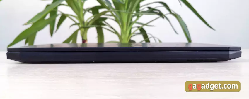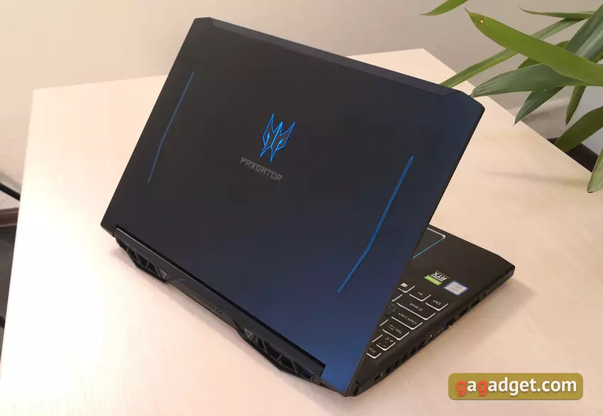 Obudowa laptopa wykonana jest z metalu i plastiku: górna pokrywa i powierzchnia robocza wykonane są z anodowanego aluminium, dolna część i rama wokół ekranu są z tworzywa sztucznego. Podstawowe kolory - piękna czerń z niebieskawym odcieniem i niebieskimi akcentami. Posiekane agresywne linie zapewniają pozycję laptopa w grach, ale kombinacja kolorów nie jest na tyle zatartą jak czarny i czerwony. Górna pokrywa ma parę niebieskich akcentów i podświetlane logo Predator.