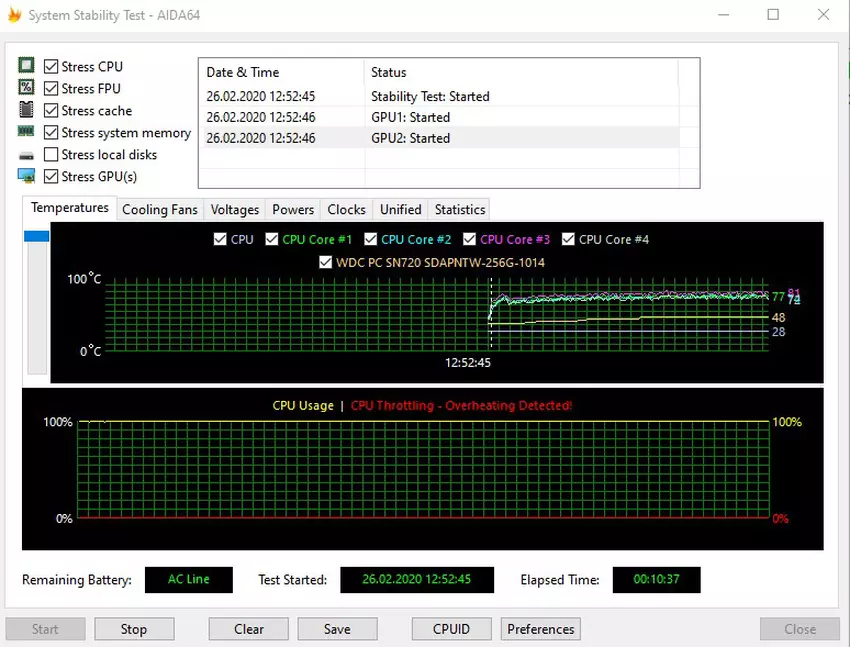 Układ chłodzenia jest wydajny i spełnia swoje zadanie. W trybie „Ekstremalnego” przetaktowywania wnętrze laptopa nie nagrzewa się powyżej 80 °, oczywiście system działa stabilnie i nie dusi się. Ale jednocześnie CO działa w trybie maksymalnej wydajności. Sprawia, że hałas w tym trybie jest bardzo zauważalny i krzyczy nad wbudowaną akustyką. Jedynym ważnym punktem jest to, że przy maksymalnych obciążeniach konieczne jest włączenie maksymalnej wydajności uchwytów za pomocą SO: tryb automatyczny nie zawsze poprawnie ocenia obciążenie. Gorące powietrze jest wydmuchiwane do tyłu i tylko trochę po bokach. Obudowa jest wyraźnie podgrzewana nad klawiaturą. W tym samym czasie sama klawiatura pozostaje zimna.