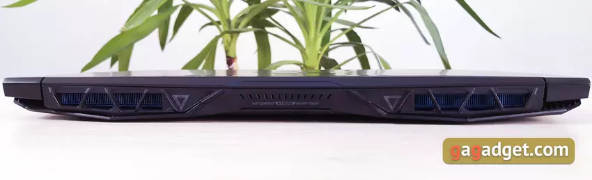 Z tyłu laptopa znajdują się duże otwory układu chłodzenia z niebieską siatką ochronną i znakami ostrzegawczymi w miejscach, które najbardziej nagrzewają się pod obciążeniem.