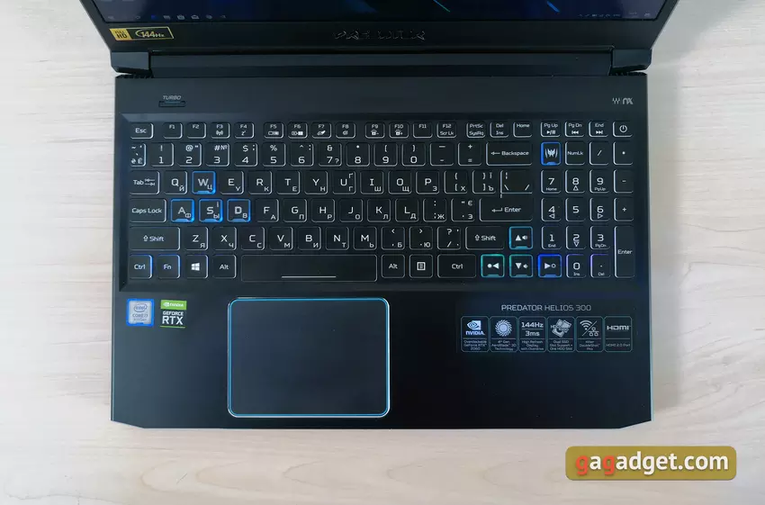 Laptop otwiera się pod kątem około 145 °, wyświetlacz jest dobrze zamocowany, chociaż nie jest to tak ważne w modelach do gier, które oczywiście nie będą używane w podróży. Jak już wspomniano powyżej, powierzchnia robocza jest metalowa i nie zgina się podczas pracy. Układ klawiatury jest identyczny z innymi modelami do gier Acer. Na przykład, Nitro 5. To jest - pełnowymiarową klawiaturę z dodatkową klawiaturą numeryczną i kilka drobnych niuansów. Strzałki nie są oddzielone od głównej jednostki przycisków, prawy klawisz Shift jest nieco mniejszy w długości. Num Lock jest przesunięty w prawo, a na jego miejscu - przycisk start firmware Predator sens. Po lewej stronie, nad klawiaturą ma przycisk Turbo, aby aktywować lepszą wydajność: