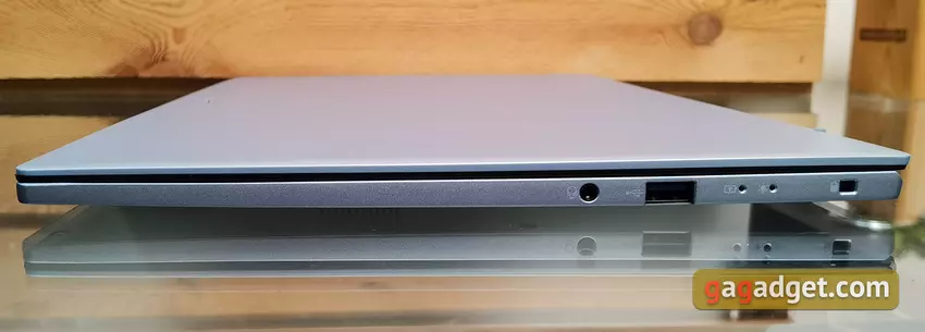 Mimo dużej przekątnej wyświetlacza Acer Swift Edge to wciąż cienki i lekki laptop. Nie przeszkodziło to jednak w zainstalowaniu dobrego zestawu złączek. Na prawym boku znajduje się łączony jack audio 3,5 mm, USB 3.2 Gen 1 Type-A, dwa wskaźniki LED oraz złącze dla Noble Lock TZ08T.