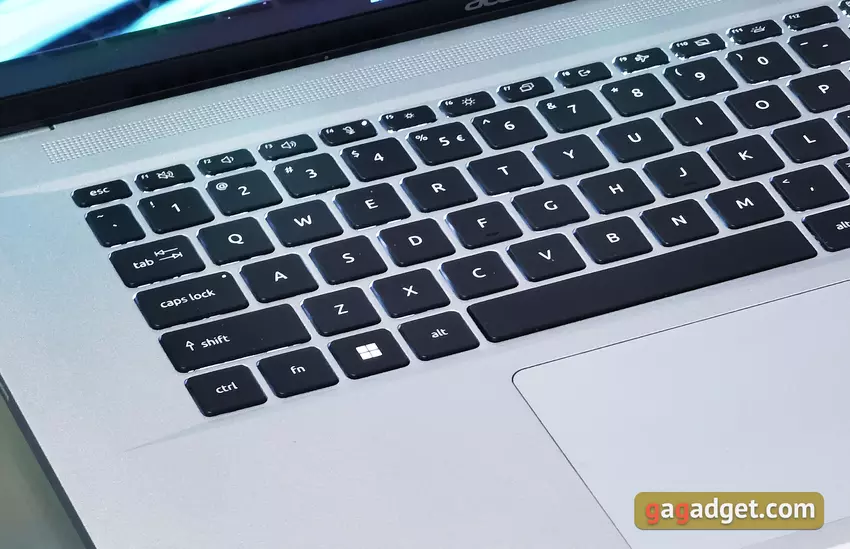 Klawiatura w Acer Swift Edge jest ogólnie bardzo dobra, ale jest kilka aspektów, które można by poprawić. Układ jest absolutnie standardowy dla 13,3 lub 14-calowych ultrabooków. Bez dodatkowego bloku cyfrowego. Biorąc pod uwagę wielkość i wolną przestrzeń na powierzchni roboczej, zmieściłby się tam całkiem dobrze. Wszystko inne jest realizowane absolutnie standardowo. Górny rząd przycisków funkcyjnych ma zmniejszony rozmiar i jest zdublowany z dodatkowymi funkcjami, w tym głośnością, jasnością, podświetleniem klawiatury i wyciszeniem mikrofonu. Rząd kończy się przyciskiem zasilania z wbudowanym skanerem linii papilarnych. Home, End, PgUp i PgDn są zdublowane strzałkami przez Fn. Oba Shift są długie, Enter jest jednopoziomowy.
