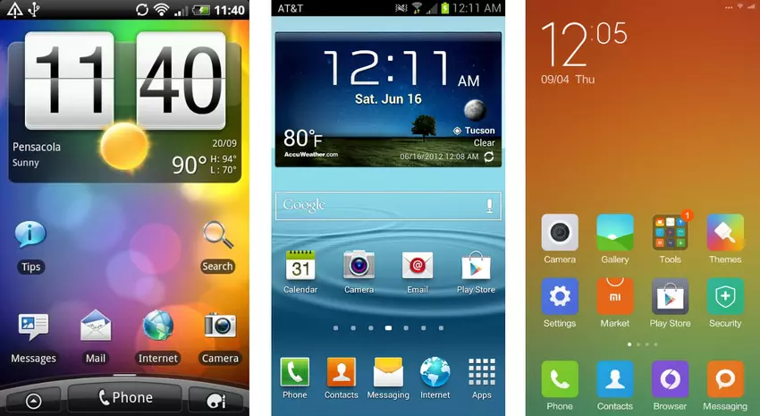 Markowe powłoki (od lewej do prawej) HTC Sense, Samsung TouchWiz (obecnie OneUI) i Xiaomi MIUI