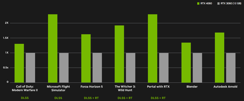 GeForce RTX 4060 to najtańsza na świecie karta graficzna z obsługą DLSS 3. Według NVIDIA, technologia ta zwiększa wydajność o 70% w porównaniu do poprzednika, GeForce RTX 3060, i o 130% w porównaniu do starszego GeForce RTX 2060. Wydajność w obliczeniach pojedynczej precyzji wynosi 15 FLOPS, czyli o 2 TFLOPS więcej niż RTX 3060.