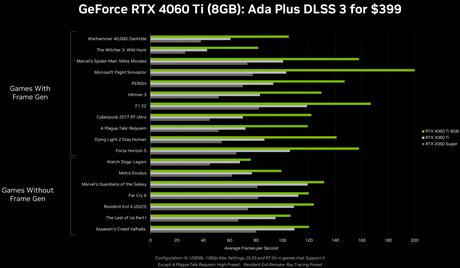 Pod względem wydajności NVIDIA obiecuje 70% wzrost w stosunku do GeForce RTX 3060 Ti. W porównaniu do GeForce RTX 2060 SUPER, wydajność modelu nowej generacji wzrosła o 160%. Wzrost ten wynika z obsługi technologii DLSS 3 i Shader Execution Reordering.