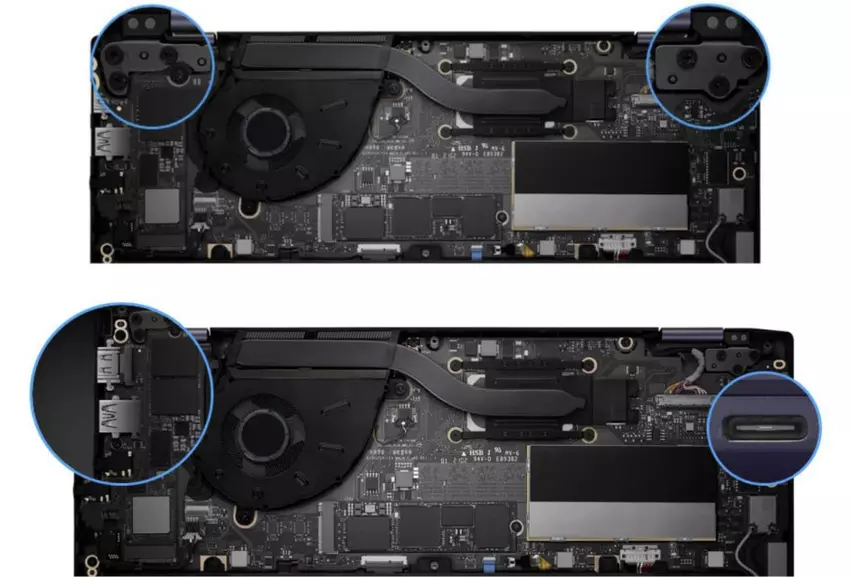 Złącza 2xThunderbolt 4 (z obsługą DisplayPort i Power Delivery), USB 3.2 Gen 2 Type-A, HDMI 2.0b, RJ-45 (przez micro HDMI), 3,5 mm audio