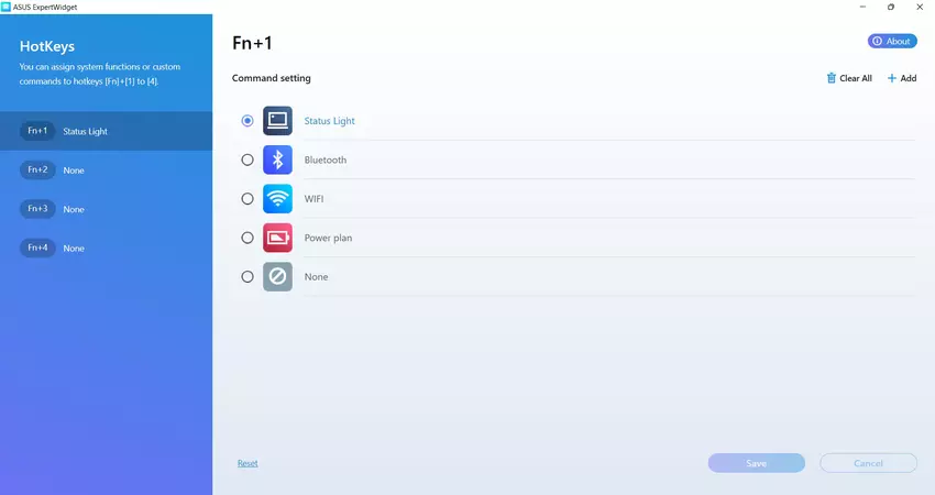 W aplikacji ASUS ExpertWidget można skonfigurować działania lub funkcje na kombinacji klawiszy Fn+1, 2, 3, 4. Mogą to być standardowe włączanie i wyłączanie interfejsów bezprzewodowych czy zmiana trybu pracy, a także uruchamianie programów.