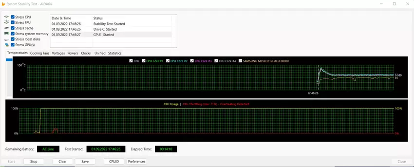 Układ chłodzenia w ASUS ExpertBook B5 jest pozbawiony jakichkolwiek cech konstrukcyjnych. W jego skład wchodzi chłodnica, rurka cieplna i jeden wentylator. Okazało się jednak, że jest zaskakująco wydajny, choć to także zasługa energooszczędnego procesora. W stress teście AIDA64 podczas maksymalnego obciążenia od samego początku podzespoły nagrzewają się do około 90° i procesor traci wydajność. W ciągu około minuty system chłodzenia dostosowuje się do obciążenia, układ pracuje z maksymalną wydajnością, a temperatura komponentów utrzymuje się w okolicach 60°. W zastosowaniach biurowych system chłodzenia nie jest słyszalny. Pod obciążeniem hałas jest minimalny. Obudowa nad klawiaturą staje się tylko trochę ciepła.