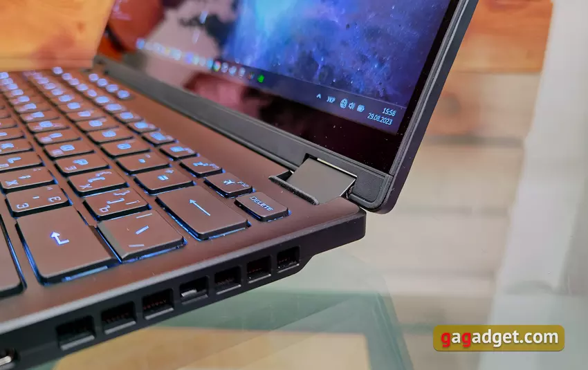 ASUS ROG Flow X13 2023 (GV302) to transformer z ekranem dotykowym, więc cały panel jest chroniony przez Corning Gorilla Glass DXC. Ramki wokół wyświetlacza są cienkie, a kamera internetowa FullHD i mikrofony znajdują się w swoich zwykłych miejscach. Uzupełnia je pasek postępu i kamera na podczerwień do identyfikacji właściciela. Laptop nie posiada skanera linii papilarnych.