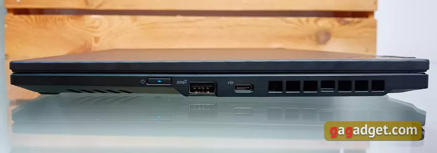 Biorąc pod uwagę kompaktowe rozmiary laptopa, zestaw złączy jest bardzo dobry. Po lewej stronie znajduje się HDMI 2.1 (dyskretna karta graficzna), gniazdo kart microSD (UHS-II), połączone gniazdo audio oraz autorskie złącze XG Mobile Connector pod gumową osłoną. Obejmuje ono autorskie złącze PCIe 3.0 x8 o przepustowości 63 Gb/s i USB Type-C 3.2 Gen 2, które obsługuje również 130 W Power Delivery i Display Port 1.4 z G-Sync (działa również z oddzielną grafiką).