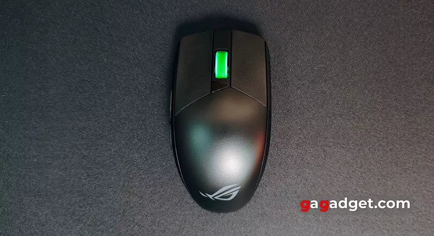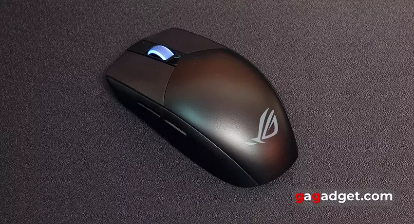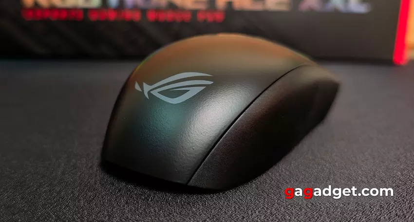 Pomimo symetrycznego kształtu, dodatkowe przyciski znajdują się tylko po lewej stronie myszy, więc można z niej w pełni korzystać tylko prawą ręką. Przyciski są szerokie i mają wyraźny odstęp. Nie ma gumowych podkładek; są małe ukośne nacięcia w pobliżu przedniej części boków dla lepszej przyczepności. Po prawej stronie znajduje się logo ROG.