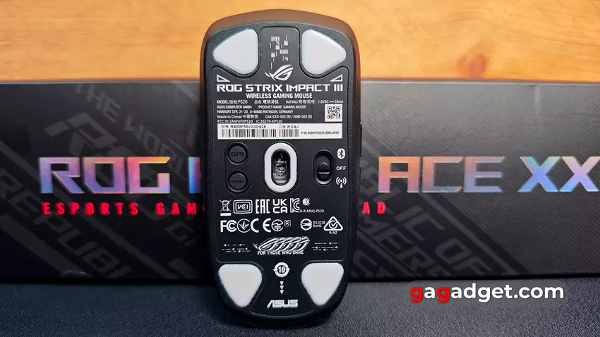 Poniżej znajdują się cztery trójkątne białe teflonowe nóżki, sensor optyczny ROG AimPoint z cienką teflonową ramką, przełącznik trybu połączenia oraz przyciski do przełączania DPI i trybów połączenia. Służą one również do niektórych regulacji w ruchu.