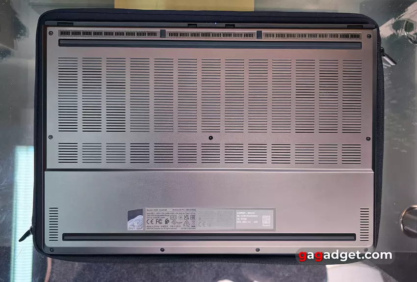 Laptop wykorzystuje ukryty zawias, tak zwany Stealth Hinge. Maksymalny kąt otwarcia laptopa wynosi około 135°. Na wypadek, gdyby ktoś naprawdę potrzebował 180°, ASUS wyjaśnia, że musiał z niego zrezygnować, aby nie zakrywać niektórych otworów wentylacyjnych. W przeciwnym razie konstrukcja jest dość znana z innych modeli ASUS: w pozycji otwartej tył powierzchni roboczej jest nieco uniesiony nad stołem. Przyczynia się to również do lepszego chłodzenia komponentów ze względu na większą przestrzeń poniżej. Klawiatura jest dość typowa dla ultrabooków ASUS: pełnowymiarowa, bez dodatkowego bloku numerycznego. Nad jednostką główną znajdują się cztery dodatkowe przyciski, typowe dla modeli gamingowych. Odpowiadają one za głośność, wyciszenie mikrofonu oraz uruchomienie autorskiej aplikacji Armoury Crate. Dla przycisków tych można skonfigurować makra. Przycisk zasilania również znajduje się nad głównym blokiem klawiszy, a jego przypadkowe naciśnięcie będzie niezwykle trudne. Górny rząd klawiszy funkcyjnych został zmniejszony, podobnie jak blok nawigacyjny. Obie zmiany są długie. Układ nie wymaga dodatkowego czasu na przyzwyczajenie się.