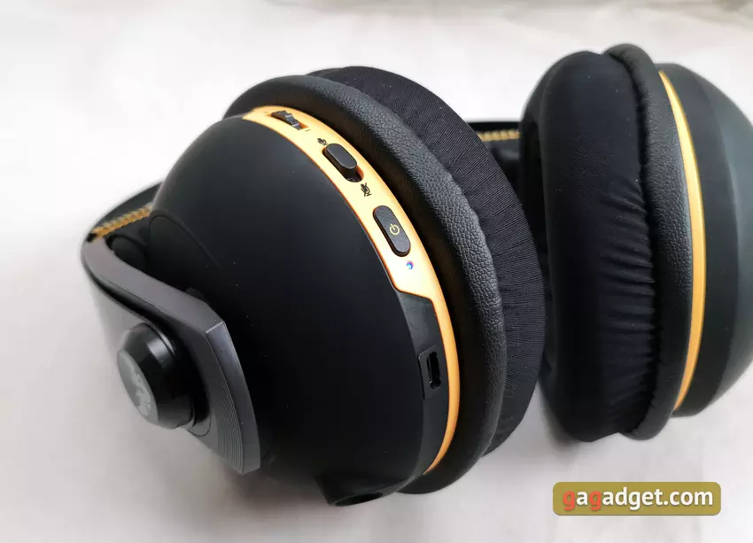 Wszystkie elementy sterujące i funkcjonalne znajdują się na lewej słuchawce. Spód - MicroUSB do ładowania zestawu słuchawkowego, powyżej - wskaźnik LED, przycisk zasilania, suwak wyciszania mikrofonu i pokrętło głośności: