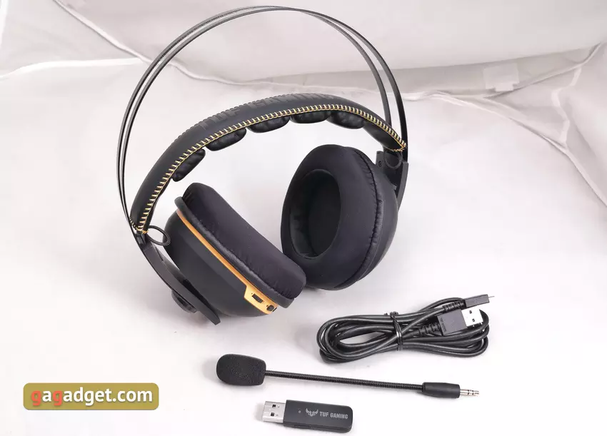 TUF Gaming H7 Wireless wykorzystuje konstrukcję z dwoma pałąkami, która jest bardzo rozpowszechniona w modelach do gier. Zewnętrzna część wykonana jest z czarnej stali nierdzewnej i służy jako rama. Drugi ruchomy pałąk jest miękki, obity skórą i wstawkami. Wewnątrz struktur, z którymi jest przymocowany do miseczek, zastosowano elastyczne wstawki. Ta konstrukcja jest wygodna do użytku domowego, ponieważ nie ma potrzeby dostosowywania rozmiaru pałąka pod głowę. Zewnętrzna część pałąka jest wytłoczona TUF Gaming, a krawędzie są zszywane żółtą linią: