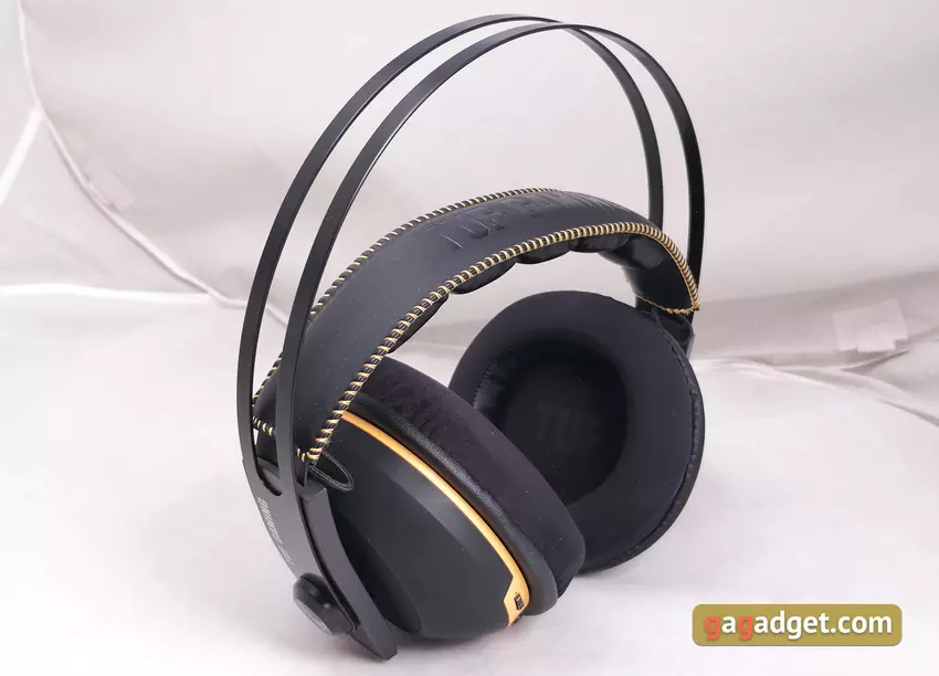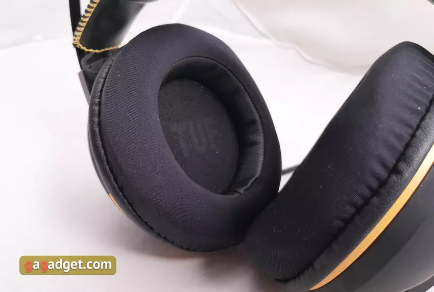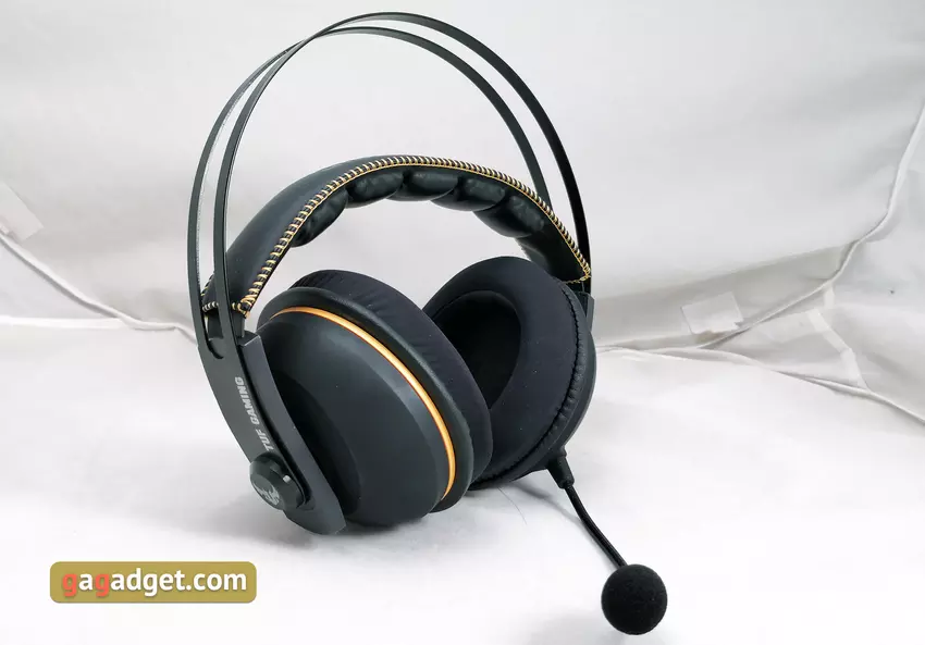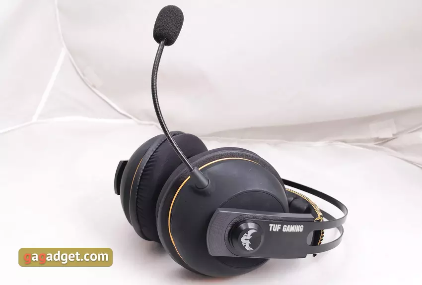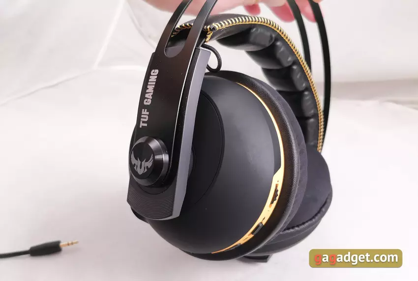 Na mocowaniach miseczek na pałąku znajdują się logo linii gier TUF, a między miseczkami i nausznikami znajdują się pomarańczowe wstawki. Główna część miseczek jest pokryta miękkim plastikiem. Odczuwa się i wygląda świetnie. Aż dotkniesz: zbiera odciski palców z wielką przyjemnością.