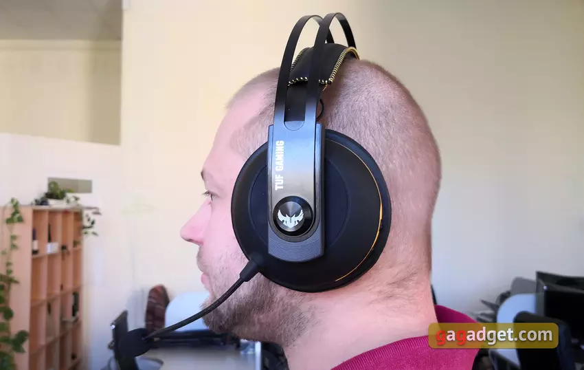 Konstrukcja z podwójnym pałąkiem na głowę jest dobra, ponieważ automatycznie przyjmuje pożądany kształt bez żadnych ustawień i pasuje do dowolnej wielkości głowy (lub prawie każdej). Zewnętrzny pałąk ma optymalny docisk: zestaw słuchawkowy nie odrywa się od głowy, ale nie naciska zbyt mocno. Dzięki dużym miseczkom i nausznikom uszy mieszczą się całkowicie wewnątrz, izolacja akustyczna jest bardzo dobra. Jest wystarczającą do użytku w pomieszczeniach, do których przeznaczony jest zestaw słuchawkowy. Przy dłuższym użytkowaniu uszy zaczynają się nieco przegrzewać, co jest zwykle charakterystyczne dla pełnowymiarowych zamkniętych modeli w lecie. Ale w tym przypadku nie jest to tak ważne: w TUF Gaming H7 Wireless możesz siedzieć przez 2-3 godziny nie zdejmując zestawu. Implementacja mikrofonu jest znana: elastyczna noga pozwala zainstalować go w dowolnej pozycji. Podczas korzystania z zestawu słuchawkowego zauważyłem tylko jeden nieco nieprzyjemny moment: stalowa opaska na głowę tworzy odczuwalny dzwon, jeślgdy zostanie przypadkowo zaczepiony.