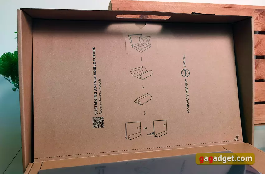 ASUS Vivobook S 15 OLED zapakowany jest w zwykłe kartonowe pudełko w kolorze musztardowym z nazwą modelu i podstawowymi informacjami. W środku znajduje się laptop, zasilacz 90W, kabel zasilający, dokumentacja oraz zestaw naklejek. ASUS często oferuje wykorzystanie części opakowania jako podstawki. Tak jest i w tym przypadku: wewnętrzna część pudełka jest w tym celu perforowana. Można ją odciąć i złożyć w podstawkę, która przyda się zarówno do użytkowania, jak i przechowywania laptopa w pozycji pionowej: