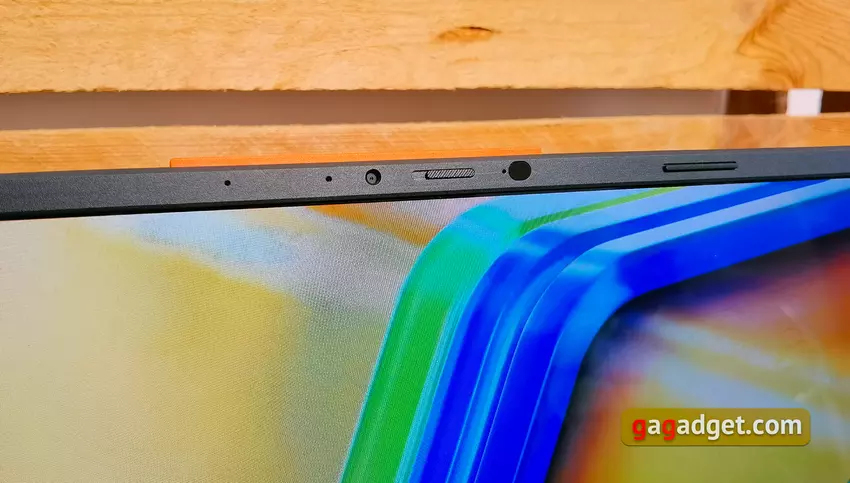 Na obwodzie wyświetlacza znajdują się gumowe wstawki. Nad ekranem znajduje się kamera internetowa FullHD z mechaniczną migawką. Obsługuje ona technologię trójwymiarowej redukcji szumów ASUS 3D Noise Reduction (3DNR) w czasie rzeczywistym, rozmycie tła i korekcję jasności. Ponadto znajdują się tam dwa mikrofony, wskaźnik kamery i czujnik światła do automatycznej regulacji jasności.