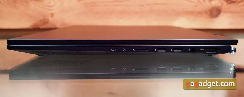 Laptop ma znajomy profil w kształcie klina, a poza nim widać zaktualizowany, okrągły, srebrny profil zawiasu. Nie ma zbyt wielu złącz, choć są wszystkie niezbędne. Na prawym boku laptopa znajduje się kilka wskaźników, czytnik kart MicroSD, dwa złącza Thunderbolt 4 (z obsługą DisplayPort i Power Delivery), gniazdo słuchawkowe lub słuchawkowe 3,5 mm oraz HDMI 2.0b.