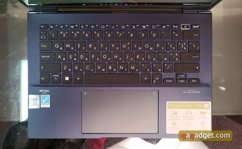 Klawiatura jest niemal typowa dla ultraportów ASUS-a. Bez dodatkowego bloku numerycznego, ze zmniejszonym górnym rzędem i blokiem strzałek. Górny rząd kończy się na Delete, a nie na przycisku zasilania. Robi się to, aby zapobiec przypadkowemu wyłączeniu. Sam przycisk zasilania jest lekko "zagłębiony" względem pozostałych klawiszy, ma wbudowany skaner linii papilarnych. Home, End, PgUp i PgDn są zdublowane strzałkami przez Fn. Oba klawisze Shift są długie, Enter jest jednopoziomowy.