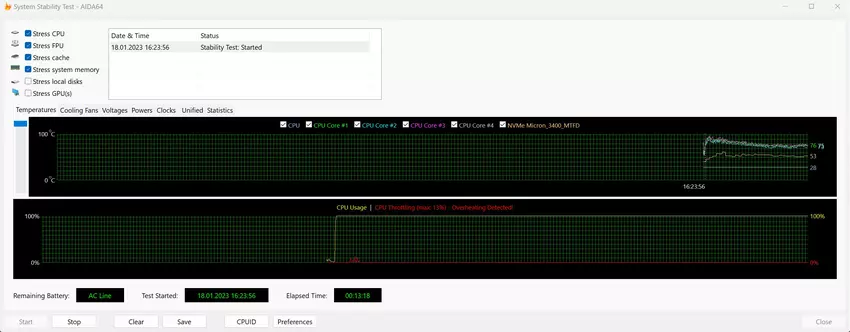 Układ chłodzenia w ASUS-ie Zenbook 14 OLED (UX3402) jest dość cichy nawet pod maksymalnym obciążeniem, ale za to dość wydajny. W teście obciążeniowym AIDA64 przy maksymalnym obciążeniu podzespoły nagrzewają się początkowo do około 95° i procesor traci wydajność, a throttling wynosi 13%. Po dostosowaniu CO temperatura podzespołów wynosi około 75°, a laptop działa stabilnie. Obudowa prawie się nie nagrzewa.