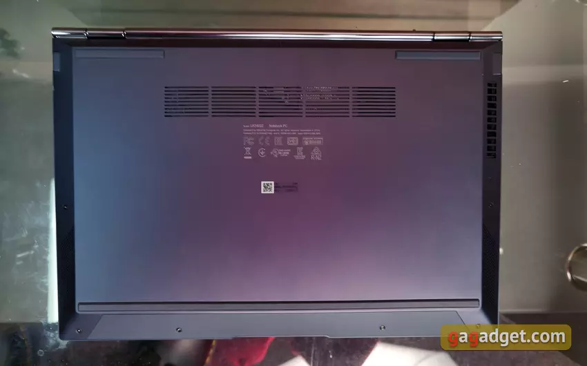 Z tyłu znajdują się dwa zawiasy i dwie małe gumowe wstawki, które pełnią rolę swoistych nóżek, gdy laptop jest otwarty. Z przodu znajduje się zwykłe wycięcie ułatwiające otwieranie laptopa.
