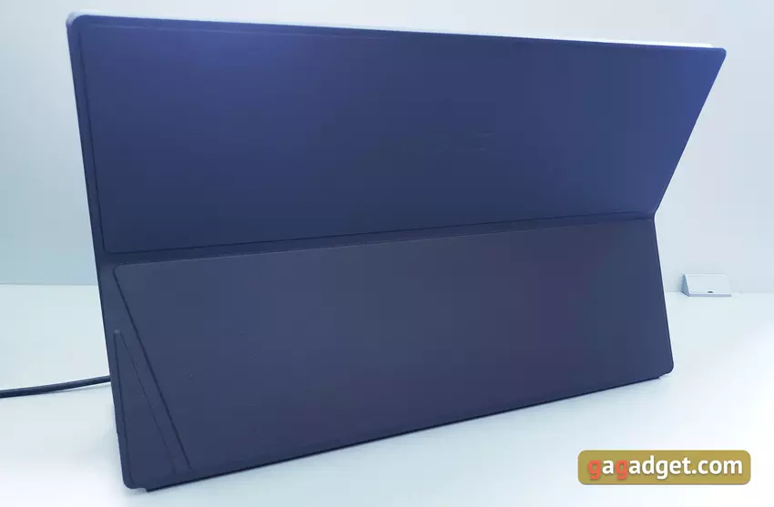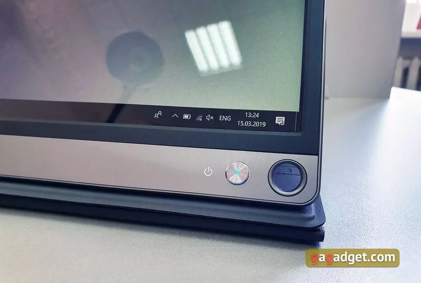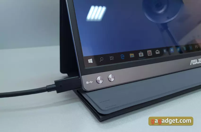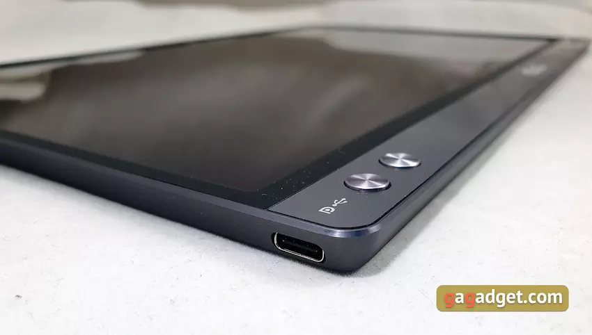 Po podłączeniu do komputera / laptopa możesz wybrać, z czego monitor będzie zasilany: zewnętrzne źródło lub bateria wewnętrzna. Aby to kontrolować, istnieje menu ekranowe, które jest kontrolowane przez dwa przyciski sprzętowe po prawej stronie. Nie oznacza to, że ta opcja jest szczególnie wygodna i oczywista.