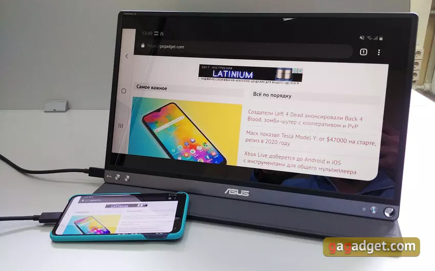 Smartfon można podłączyć za pomocą dostarczonego kabla typu C. Producent zaleca instalację aplikacji DisplayLink, chociaż nowoczesne smartfony „kontaktują” z monitorem i bez niego. Obsługiwane są również modele z obsługą trybu pulpitu (Samsung Galaxy S10e natychmiast przełączył się na tryb Dex). Ale dla komfortowej pracy nadal warto podłączyć klawiaturę i mysz Bluetooth: ekran nie jest wrażliwy na dotyk: